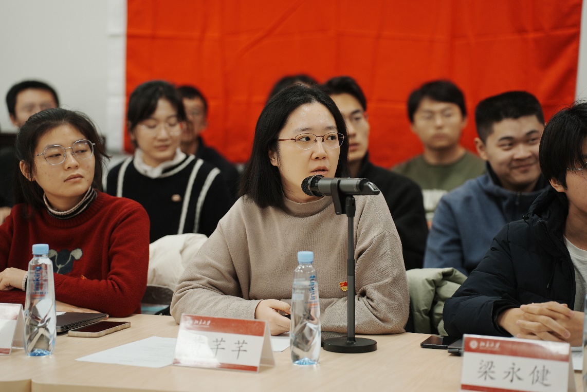 在自由交流环节,学生第二党支部代表钟婷婷同学谈到,文化自信包含了对历史的归属和认同,以及基于此形成的对未来发展的信心,是国家、民族的立足之本,是个人的信仰之基。青年学子应当做到文化自知,践行文化自信,保持本心,坚定向前,展现中国智慧,建立中国的话语体系。党支部代表高天同学谈到,要充分构建对我国国家、民族文化的认同,这既要求我们充分了解学习党史国史,体悟文化内核,也需要我们将其与自身生活结合,在生活中展现文化魅力,提升我国的文化软实力。