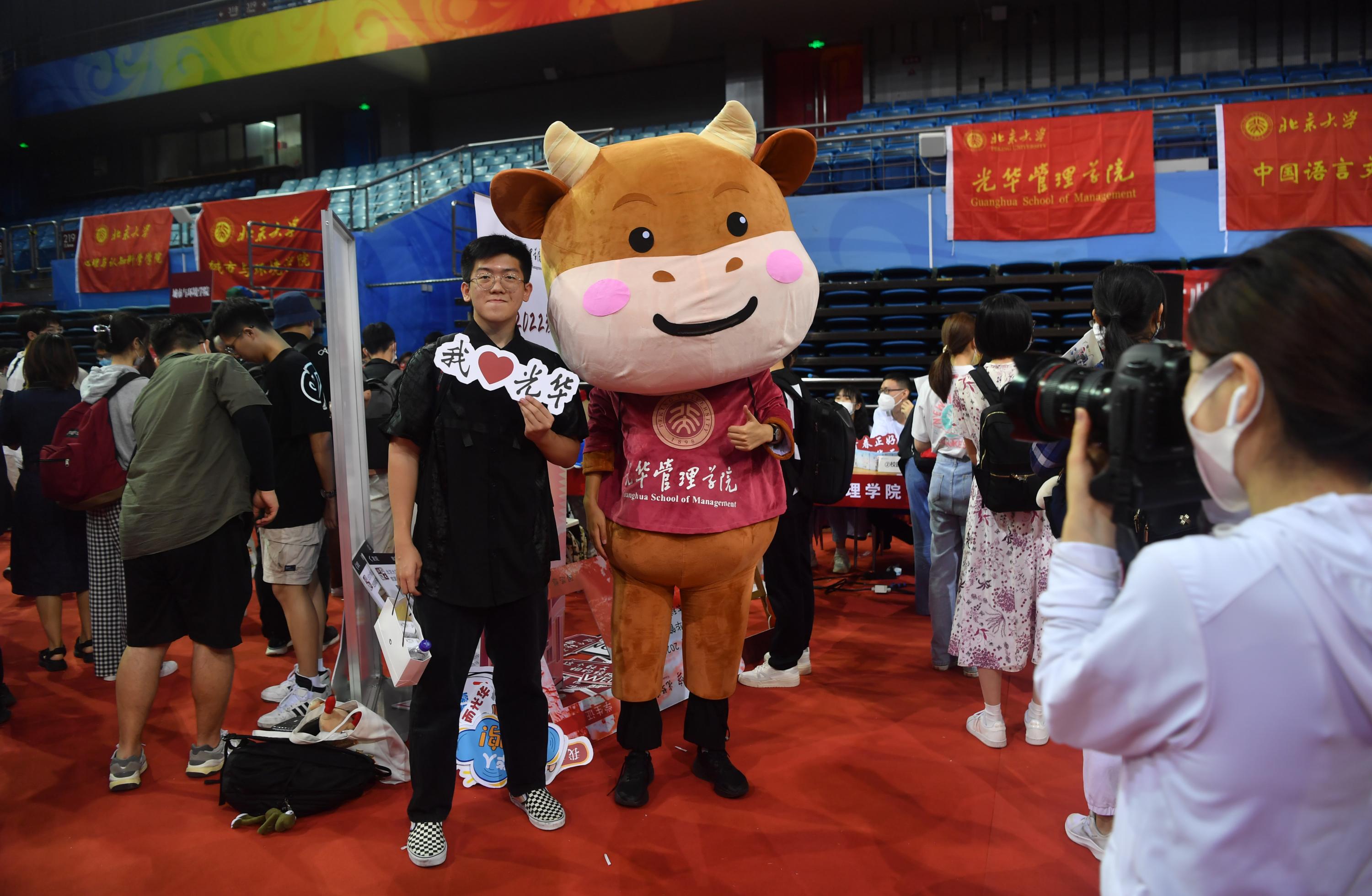 新生在报到现场与学院的吉祥物合影留念。新京报记者 李木易 摄
