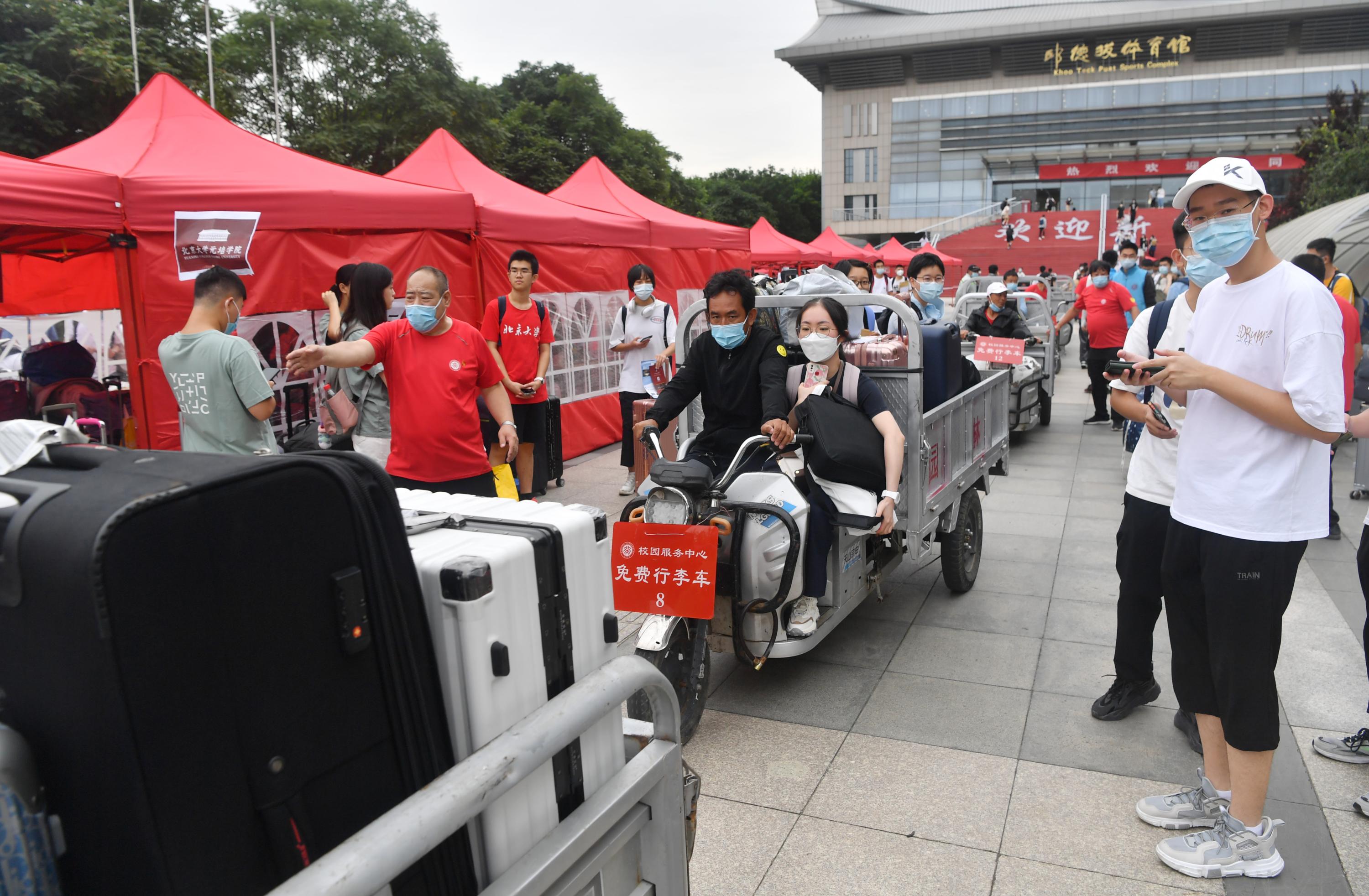 8月28日至29日两天,从6:30至19:00在北京站、北京西站、北京南站、首都机场、大兴机场设接待站,现场有身着红色戴北大标识T恤的工作人员和蓝色马甲的学生志愿者进行引导。新生持录取通知书、48小时内核酸检测阴性证明和“北京健康宝”绿码即可乘坐迎新校车进入北大校园。