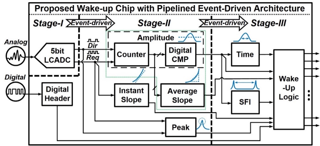 微纳电子系的黄如院士-叶乐副教授课题组,与浙江省北大信息技术高等研究院、上海芯翼信息科技有限公司合作,在国际上首次提出了多级流水异步事件驱动型芯片架构,将传统的周期性工作模式转变为异步事件驱动型工作模式,显著降低了物联网节点在“随机稀疏事件”场景下的功耗。课题组同时提出了时域屏蔽型阈值交叉模数转换器LC-ADC(Level-Crossing ADC)技术,解决了“噪声误触发导致功能错误和功耗上升”这一传统LC-ADC所固有的难题;并设计了基于时域脉冲信号处理技术的多功能信号特征判决器电路,通过离线或在线软件定义的方式实现了对幅度、斜率、时间间隔、波峰、波谷等信号特征的组合判决,满足了物联网唤醒芯片对通用性的需求;此外,该芯片无时钟信号和时钟网络,去除了芯片在待机状态下的主要功耗来源。