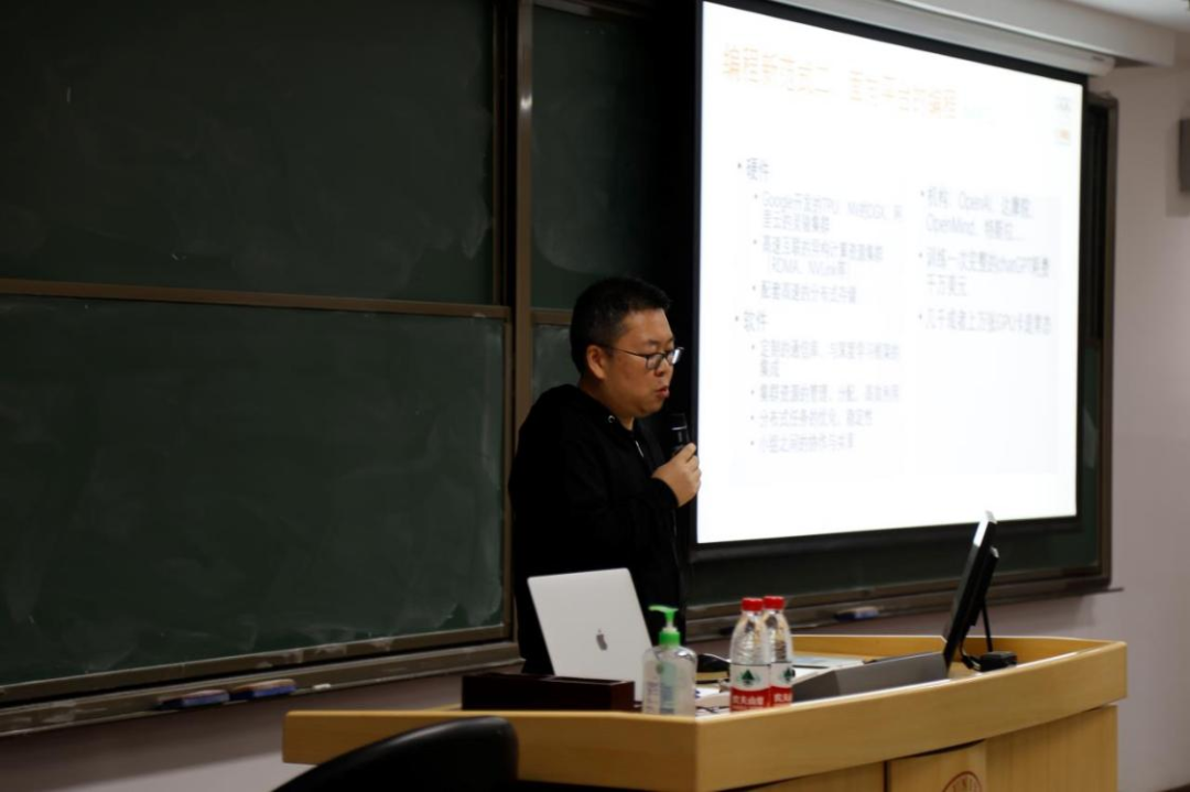 接下来,谭锋老师提出了四点“编程新范式”。第一点是“面向模型的编程”。谭锋老师认为过去的编程是以数据结构+算法为基础实现的一种可解释,结果可预测且可以稳定重现的的编程,而今后的编程可能是一种数据+模型+训练为基础的编程,虽然这种编程存在不可解释、结果不稳定等缺陷,但具有相当大的利用价值。第二点是“面向平台的编程”。AI模型的训练成本很高,对软硬件都提出了相当高的要求。因此在硬件方面,要考虑使用高速互联的异构计算资源集群,配置高速的分布式存储等,在软件方面,要使用定制的通信库,注意与深度学习框架的集成并做好集群资源的管理、分配和高效利用,实现分布式任务的优化和稳定性。第三点是“面向Prompt的编程”。在有了强大的人工智能工具后,可以让AI来生产代码,而人类只需要进行良好的、逐步引导的Prompt。然后由人类来完成Code Review和sign-off的工作。第四点是“面向云计算的编程”。云计算提供了庞大的算力和基础设施,既然如此,在编程的过程中就考虑到“上云”,基于云计算平台来进行软件的设计与开发将会带来很多方便。