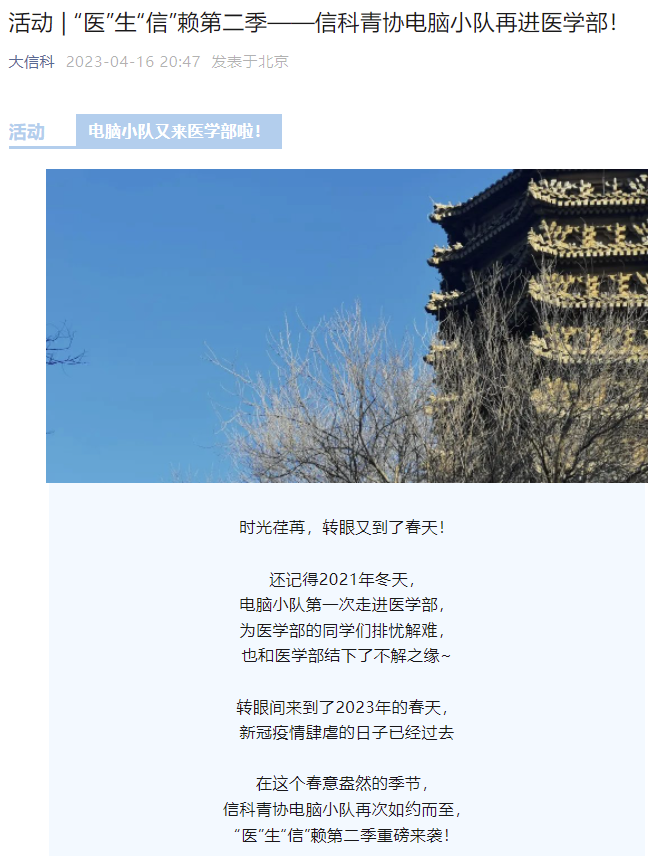 信科青协和医学部青协双方高度重视此次联合活动,提前进行了详细的沟通和安排。在总结了往年历次电脑小队活动经验的基础上,本次活动采用“微讲座+问答交流+现场维修”的创新形式,并在维修阶段开放观摩机会。4月16日,医学部青协在公众号“北医青协”上、信科学院在公众号“大信科”上同步发布活动推送,多方位展开宣传,收集同学们的维修需求。