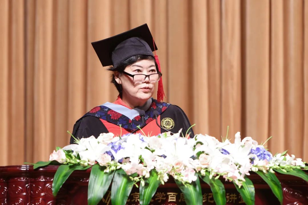家长代表,刘珈征同学的母亲程君女士在发言中分享了自己对北大的校园生活的几点感触:北大的同学有清晰的个人规划,丰富的资源也为个人目标的实现提供了支撑;北大有着良好的风气,同学之间学人所长、补己短板,形成了一个优秀的团体;北大的风格让人追求精神的丰富,安于简朴的生活。在这样的校园里,她欣喜地发现女儿培养了独立思考、多角度看问题的能力,处理问题也变得得心应手。在此,她对北大的老师和同学表达了真挚的感谢,鼓励同学们成为善良、健康、真实、有责任感的北大人。
