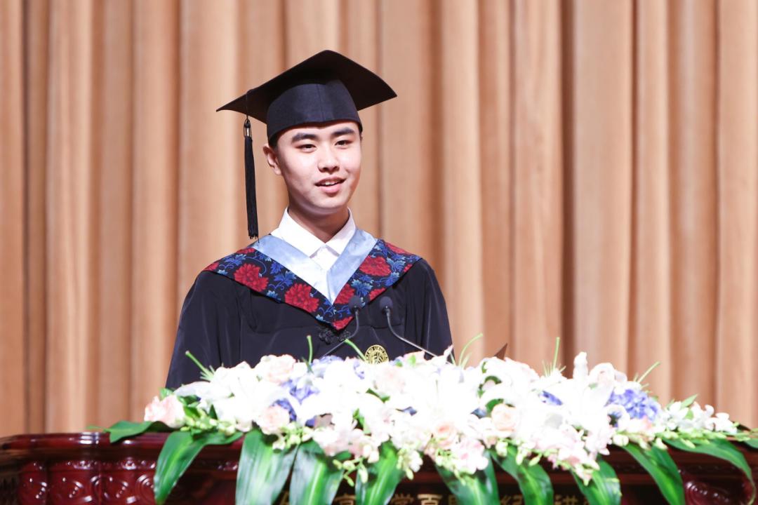 毕业生代表秦昊回顾了自己的四年燕园时光。故事开始于在邱德拔与“攻城狮”的第一张合影。故事中,有129合唱的激昂歌声,有信科足球队的拼搏精神,有学生工作中的默默奉献。还有那些与大作业搏斗的夜晚,本科生科研中的挑战,社团文化的精彩,图书馆书海的浩瀚。四年过去了,他依旧回答不出自己在北大的愿望,只因在这里,有无限的可能。