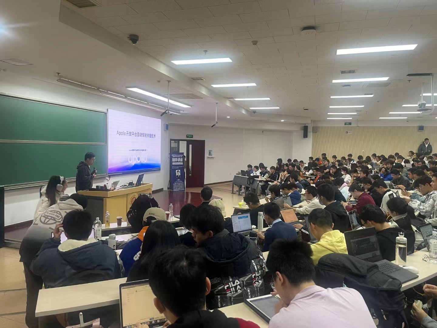 理科教学楼208教室顺利举办。百度Apollo高级产品经理苏菲菲老师受邀进行了以“自动驾驶挑战与Apollo开放平台”为主题的分享,近三百位同学到场聆听。