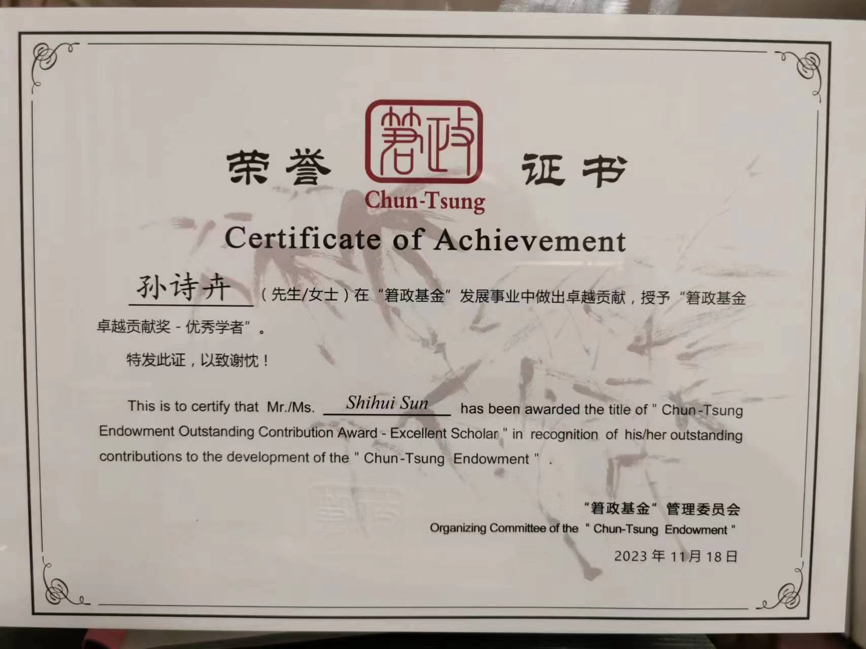 孙诗卉同学(左三)领取“䇹政基金卓越贡献奖”优秀学者获奖证书