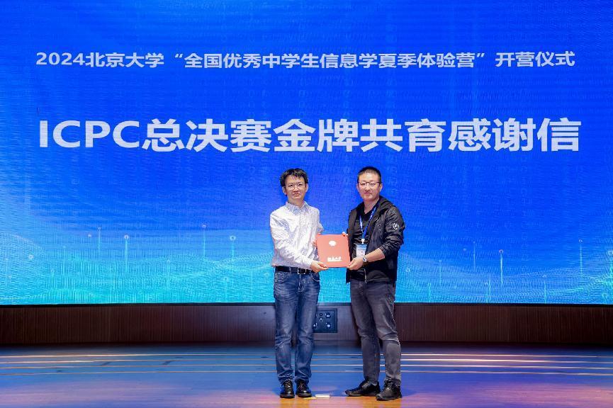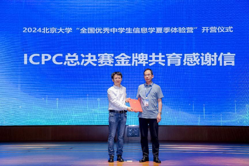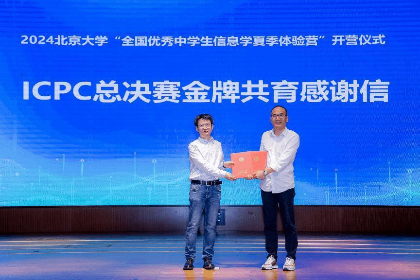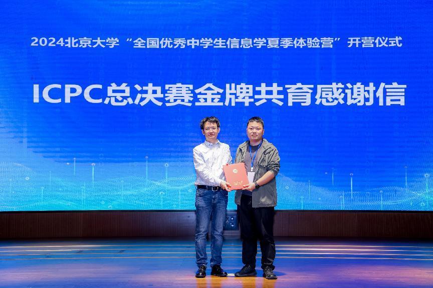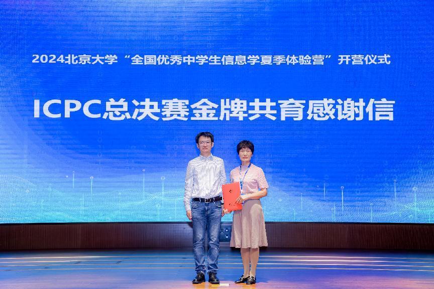 和优秀中学共同的育人成果。仪式上,陆俊林代表学院宣读了ICPC总决赛金牌队伍所在中学教练的感谢信。侯士敏为绍兴市第一中学陈合力老师、西南大学附属中学校潘玉斌老师、宁波市镇海中学符水波老师、广州大学附属中学王晓鹏老师、四川省成都市石室中学曾贵胜老师等五位教练代表颁发共育感谢信,籍此感谢全国各中学参与信息学学生培养的老师和教练们的辛勤工作和心血投入。