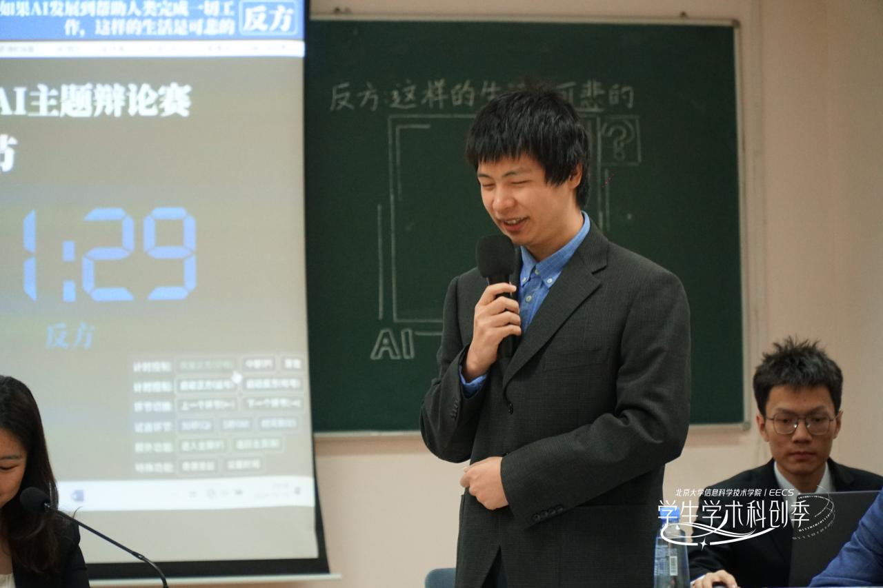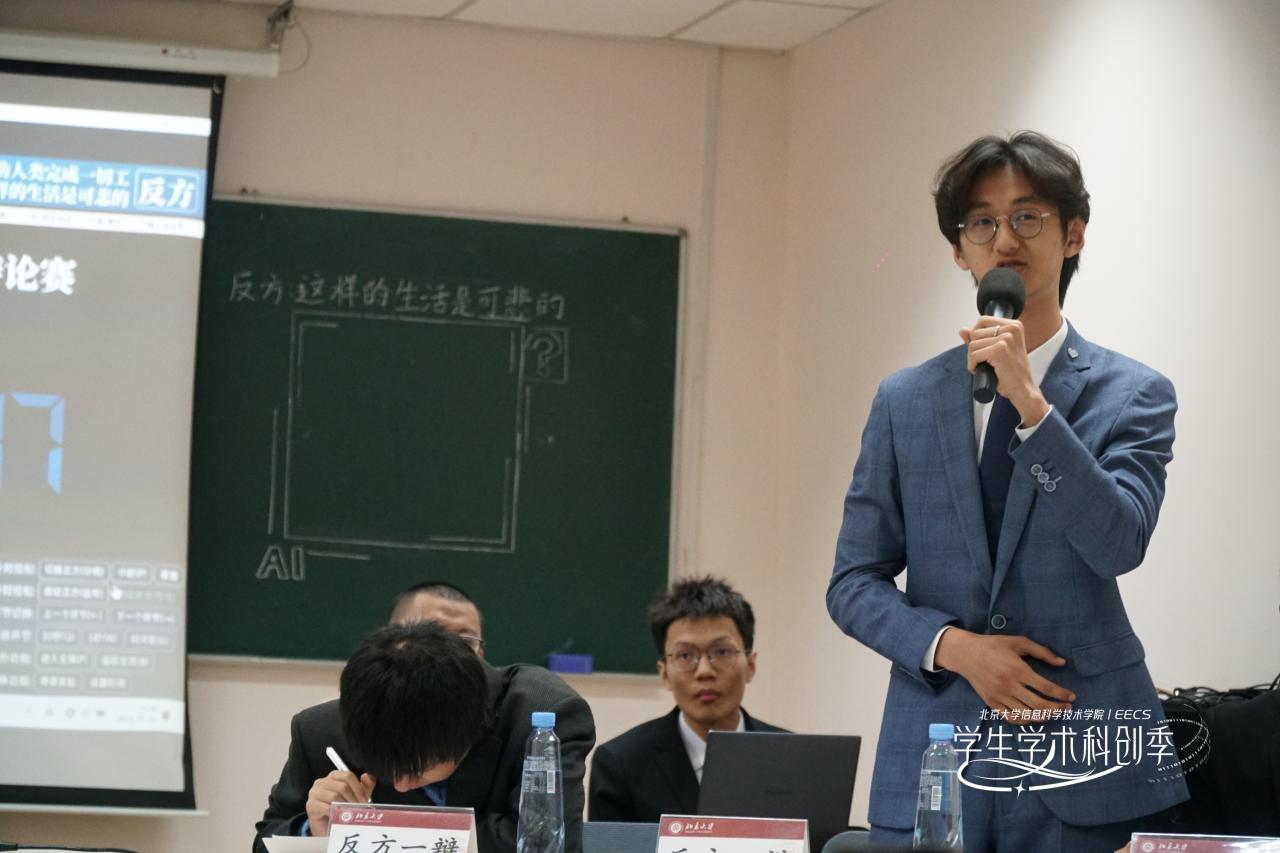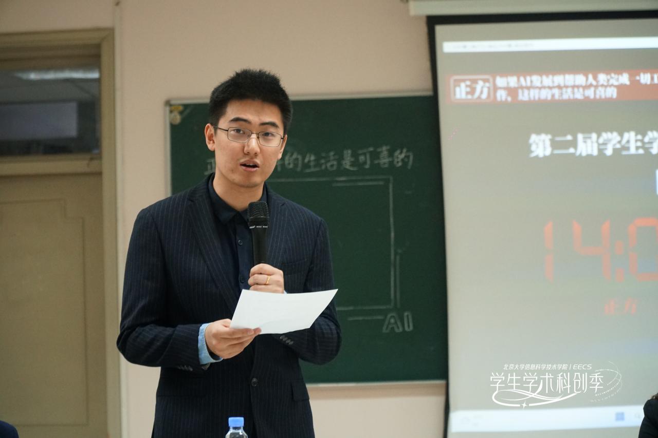 525晚,大语言模型(LLM)科普荟之“AI主题辩论赛活动在理科一号楼1126教室成功举办。信科辩论队成员赵旭峰、连昊、李明隆、肖天尧组成正方代表队,郭子荀、李诗阳、薛良玺、王楷斐组成反方代表队,北大学生辩论协会会长胡元楚担任主席。本场比赛邀请到华为资深HR熊裕华老师,明汯投资北京办公室主管郭金霞老师,智班学术委员会主席丁昱菲同学2023年国际华语控烟辩论邀请赛冠军、信科辩论队教练乔瑞同学担任评委。学院团委书记吕媛老师也出席了活动。