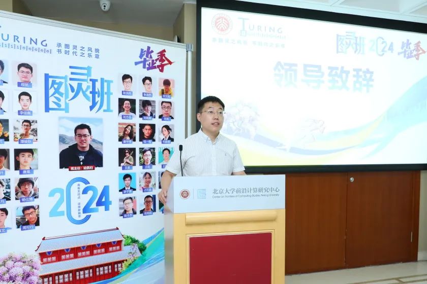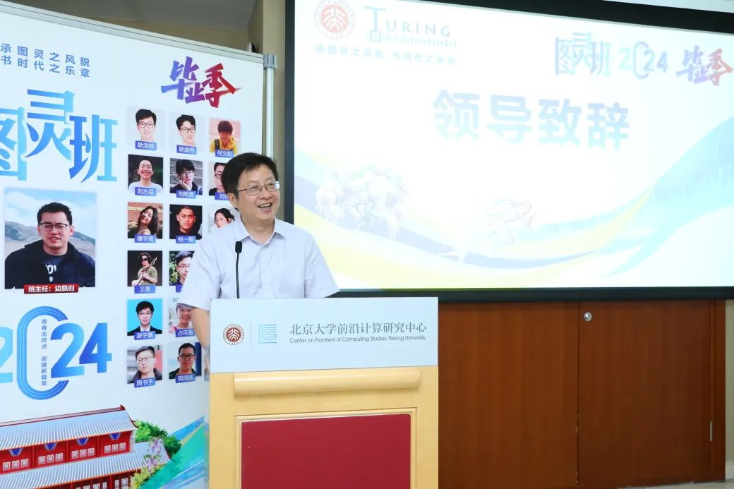 首先,信息与工程科学部主任、前沿计算研究中心联合主任高文院士通过视频致辞。他首先赞扬了2024届图灵班优异的科研成绩:发表了50余篇论文,其中25篇为一作。他希望图灵班的同学们无论是进入学术界还是工业界,都能做到极致,成为行业的领军人物。尽管图灵班的历史相较于清华姚班还很年轻,但他期望在未来的十年或十五年后,图灵班的同学们也能像姚班一样,涌现出一批知名人士,为国家和社会做出最大的贡献。
