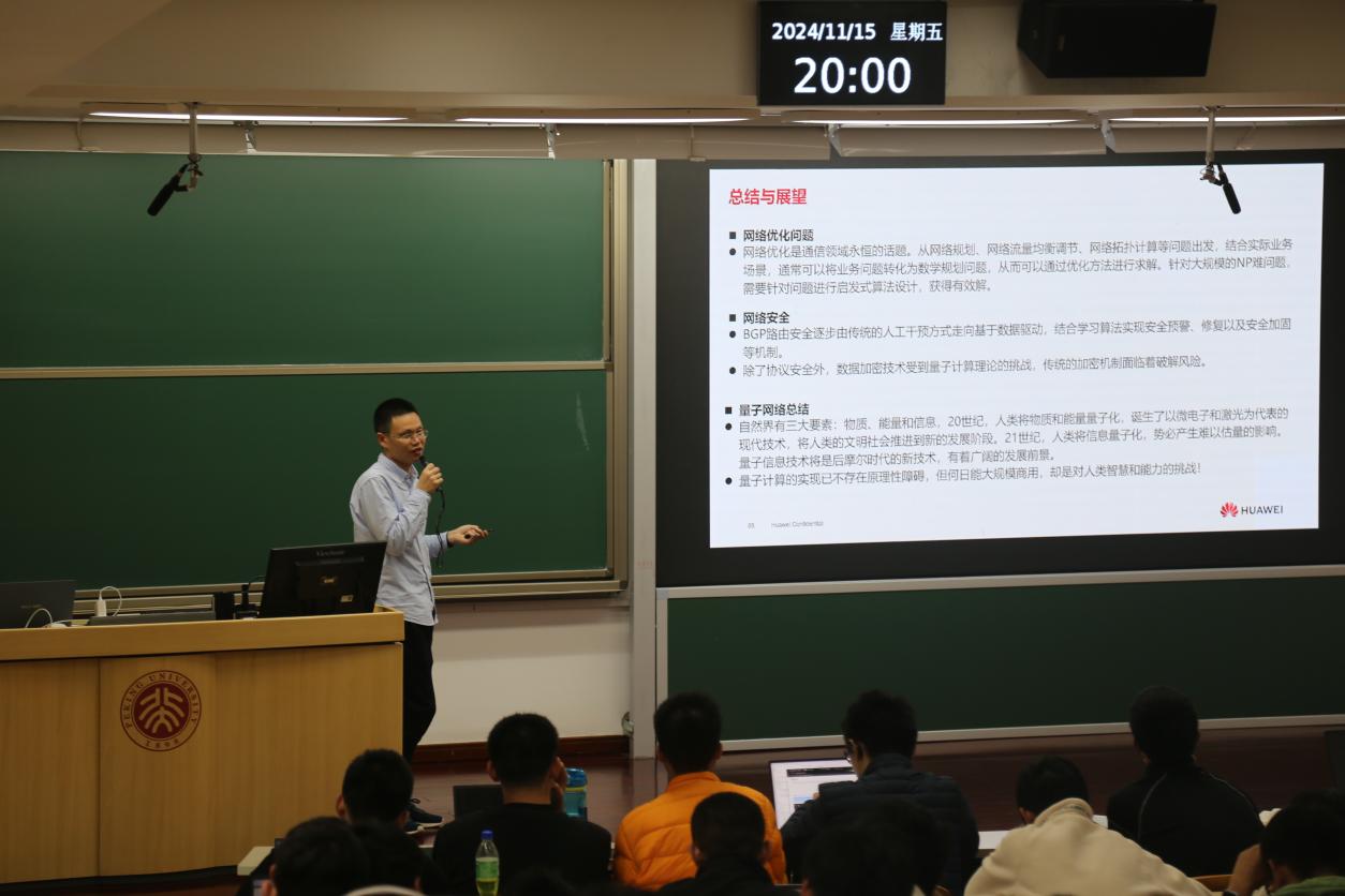 讲座的最后,戴博士对数据通信做出了总结与展望。网络优化问题是通信领域永恒的话题,可以将业务问题转化为数学规划问题,针对大规模的NP难问题进行启发式算法设计以获得有效解;BGP网络安全正在由传统的人工干预转向基于数据驱动,结合学习算法实现安全预警、修复和安全加固。同时由于量子计算理论的发展,数据加密问题已然受到挑战;量子信息技术将是后摩尔时代的新技术,有着广阔的发展前景。同时,虽然量子计算的实现已经不存在原理性障碍,但受限于某些问题还未能大规模商用。