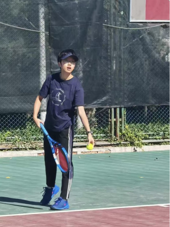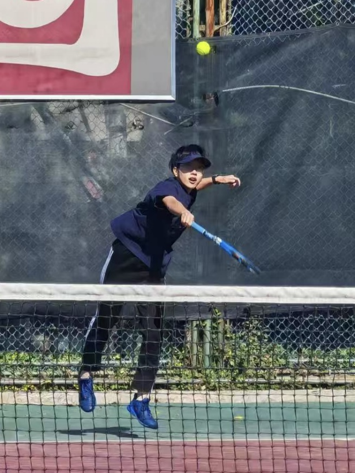郑睿扬在网前准备截击,后面的小朋友聚精会神地观战