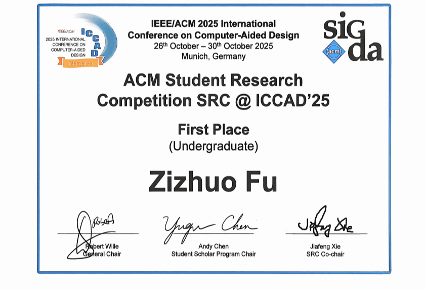 按照学校“科技创新年”的规划部署,学院积极鼓励学生参加各类科技类竞赛,在国际舞台上充分展现了北大学生的科研实力与创新潜能。本届 SRC 竞赛由美国计算机学会(ACM)设计自动化专业委员会(SIGDA)主办,是国际集成电路与电子设计自动化领域最具影响力的学生科研竞赛之一。来自全球多所高校的31名优秀学生入围首轮评选,经过海报展示和现场答辩评审,傅子酌最终脱颖而出,摘得本科生组桂冠。