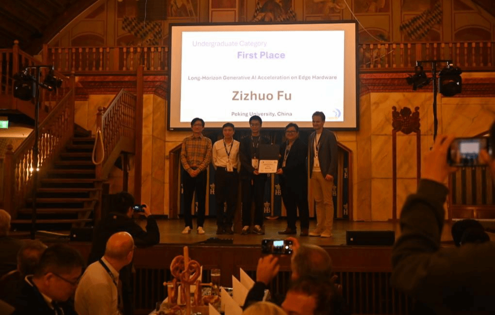 傅子酌的获奖项目 “Efficient Generative AI Acceleration on Edge” 聚焦于资源受限的边缘设备上生成式人工智能的高效加速,围绕端侧部署下的性能与能效优化开展研究,展示了在生成式 AI 算法与硬件系统优化结合方面的创新探索。其中,针对模型在边端分布式异构系统的部署,构建了超图分割算法框架以显著降低设备间通信开销,相关成果荣获 2024年集成电路创“芯”大赛·EDA精英挑战赛最高奖;针对边端图像生成算力受限的问题,设计了多模态生成式智能系统,通过 DeepCache 优化实现高效加速,获得 DAC 2025 系统设计竞赛冠军;提出的基于混合键合架构的稀疏注意力机制 H2EAL 有效提升了边端大模型的长序列推理性能,相关论文发表于 ICCAD 2025。