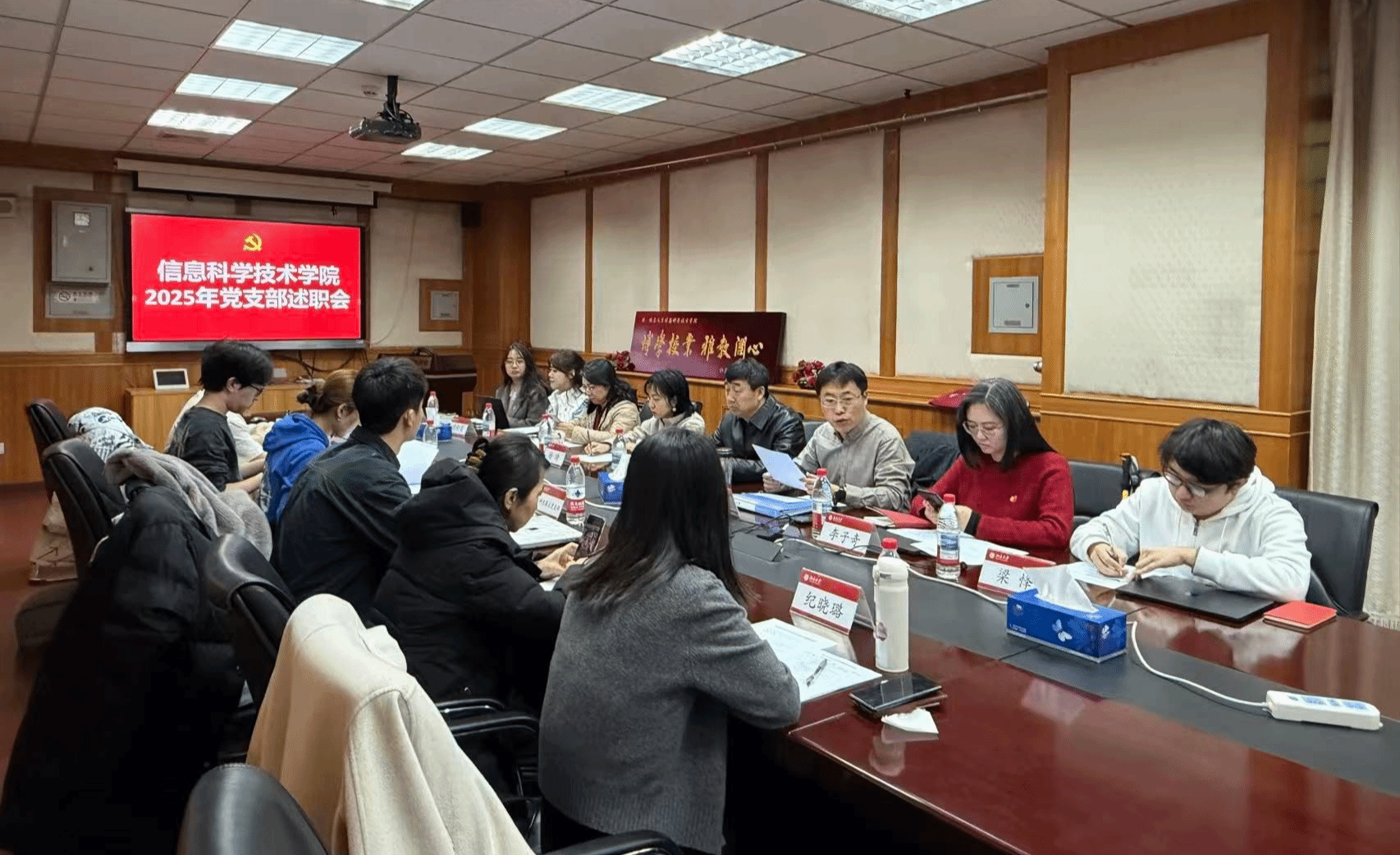 党委在理科二号楼2111会议室组织召开2025年度党支部书记述职评议会。学院党委书记严敏杰、师生党支部书记、学工团委和党政办老师参加了会议。述职会由学院党委副书记贾方健主持。