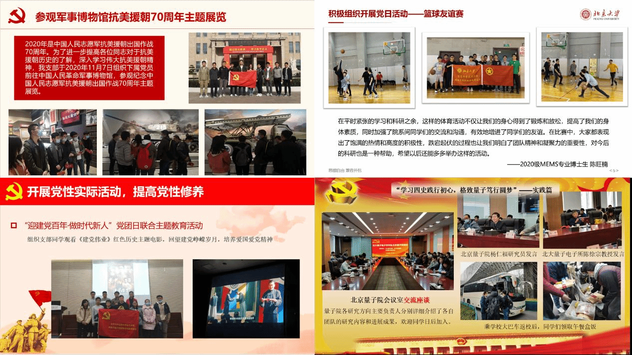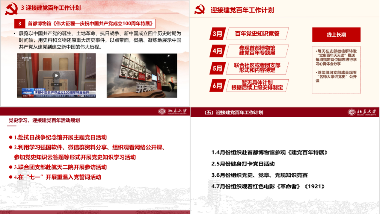 此外,为迎接中国共产党成立一百周年,各支部还制定了具有支部特色的工作计划。例如,智能科学系硕士生党支部计划赴首都博物馆参观“建党百年特展”;计算机应用博士生党支部计划每天在党支部群内分享微信公众号“共产党员”的每日“党史百年天天读”推送,鼓励同学们积极分享学习心得,并定期线上开展党史学习讨论会,等等。