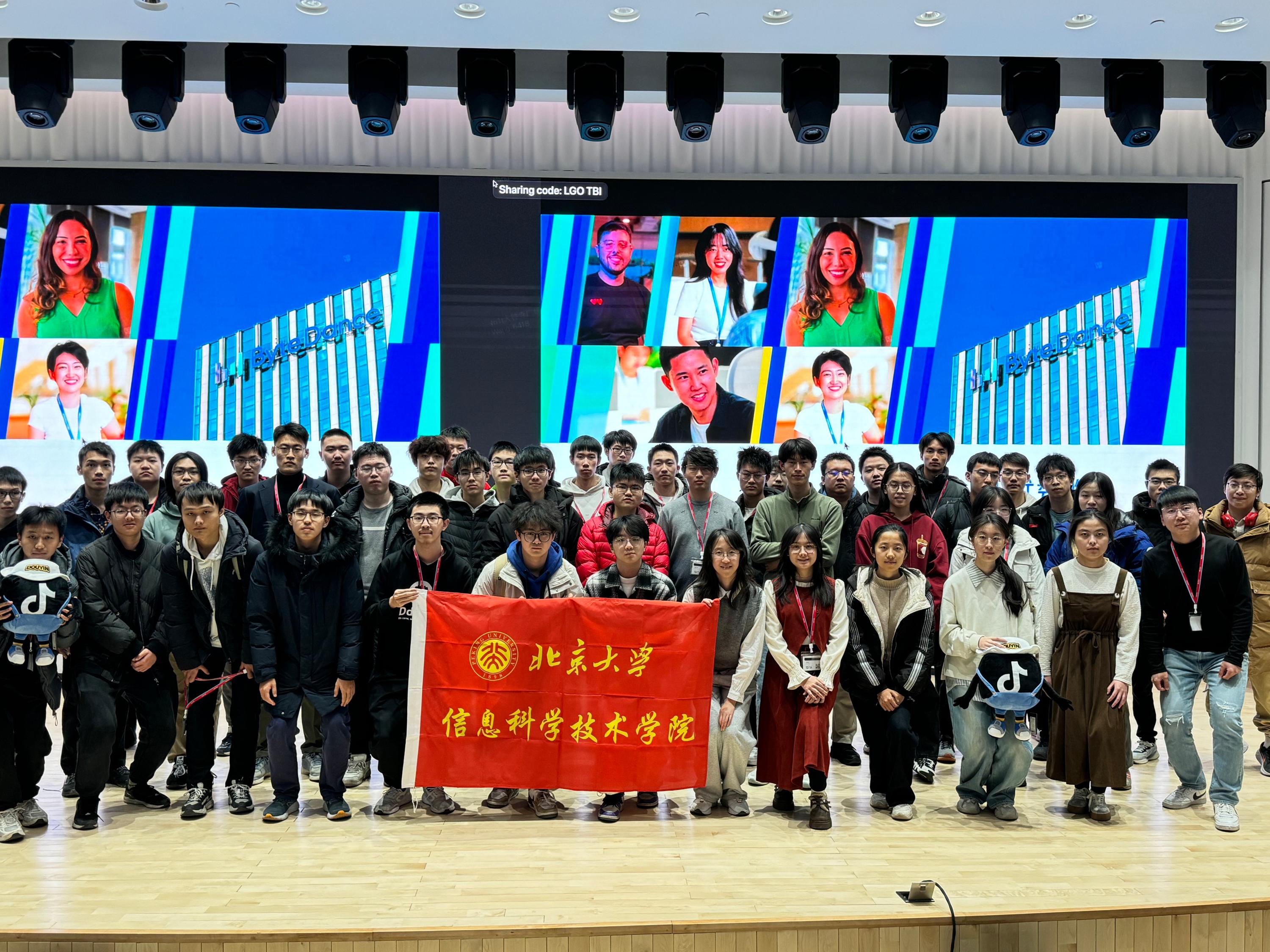 的校友马思孔、郑嘉毅和同学们展开了面对面交流。马思孔主要负责字节跳动内部芯片的开发,他介绍了互联网芯片制造行业的天然优势和业务方向。郑嘉毅介绍了他所负责的抖音搜索业务,如内容推荐、内容排序等。嘉宾们耐心回答了同学们提出的关于职业规划、方向选择和实习方面的问题,会场气氛融洽活跃。