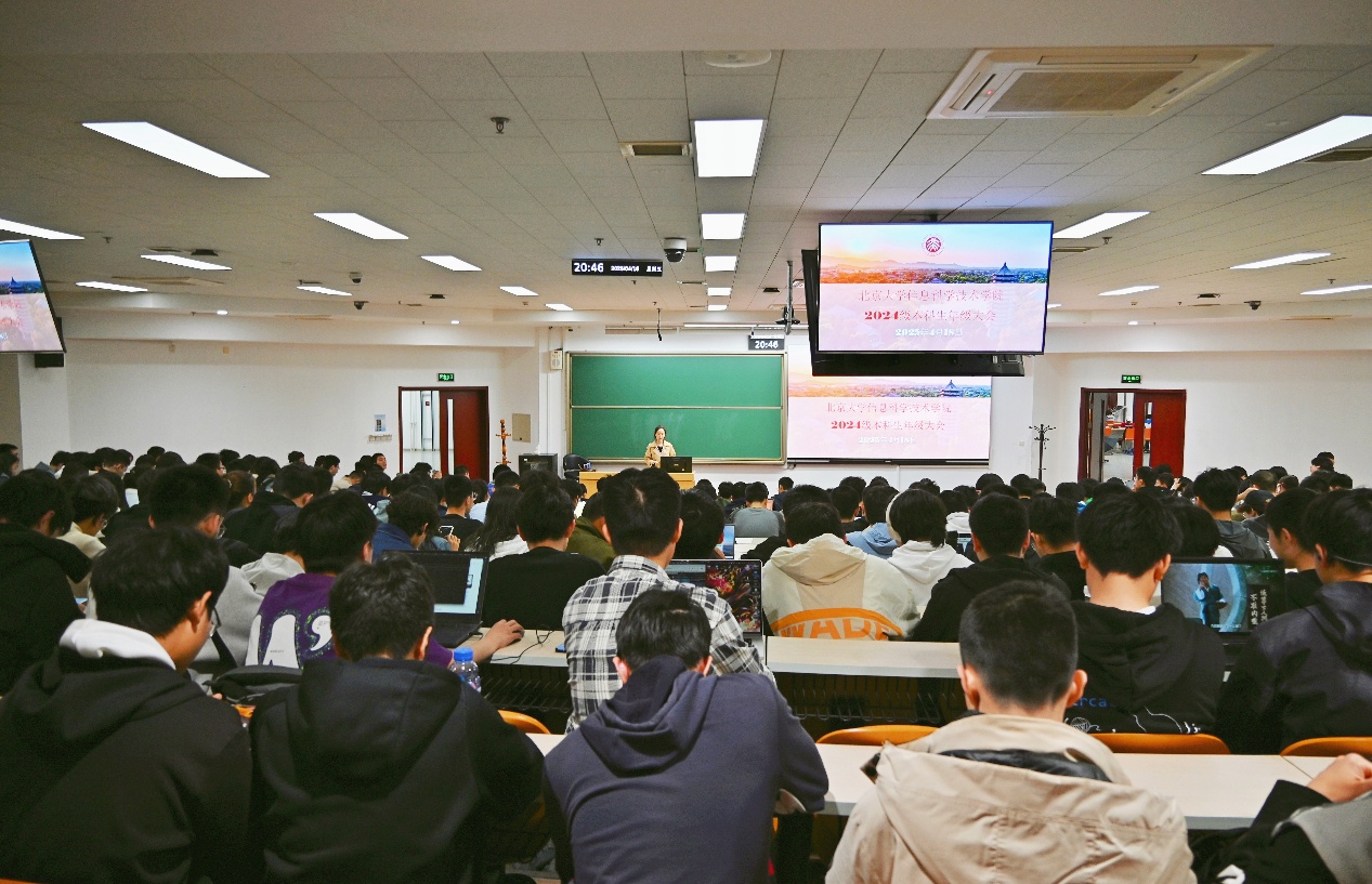 20时45分,2024级年级大会在年级辅导员付晓倩主持下开启。教学办主任董晓晖聚焦大类培养方案、专业分流、实验班选拔、辅修/双专业等同学们关注的问题做了详细的解析,对大一同学第一个学期的绩点情况进行了介绍,并对一些重要时间节点做了提醒。副院长陆俊林从课程体系、科研实践资源等方面为同学们进行了解读,他强调大一学生要合理规划学习节奏,期望同学们能夯实数理基础、拓宽跨学科视野、主动融入世界科技前沿和国家发展战略。学工办干部付晓倩对本学期学生工作的相关情况进行了介绍,对即将到来的五一假期做了安全提醒。郑子杰院友以“大一关键抉择”为切入点,结合自身求学与职场经历,分享了“如何将课堂知识转化为核心竞争力”的思考。