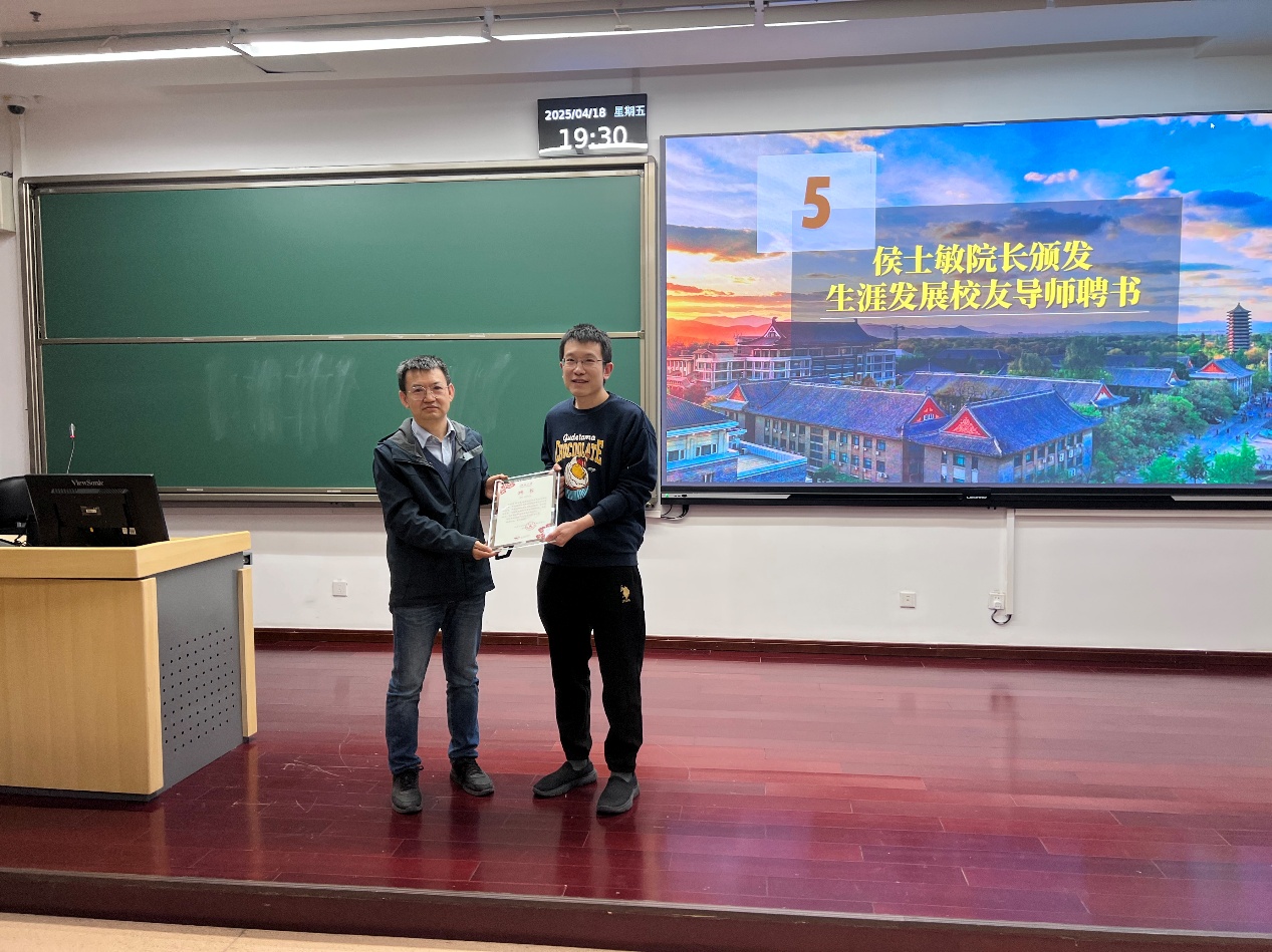 启动了学生生涯发展校友导师计划。信科2014届本科、2019届博士郑子杰是学院推荐聘任的首批导师之一,院长侯士敏为其颁发导师聘书。郑子杰院友结合自身经历,以“我在中学从事基础教育”为主题,真诚分享了自己的在校经历和职场故事,为即将面临生涯选择的同学们提供启发。